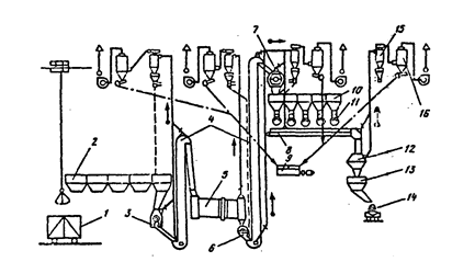 На рис. 16 показан один из вариантов принципиальной схемы комплексной очистки технологических выбросов составных цехов (дозировочно-смесительных отделений). Уловленная циклоном пыль возвращается в расходный бункер соответствующего сырьевого материала. Шлам, образующийся при работе мокрого пылеуловителя, отстаивается и высушивается, после чего может использоваться как добавка к шихте после соответствующей корректировки ее состава. Осветленная вода из отстойника возвращается для повторного использования в пылеуловитель.