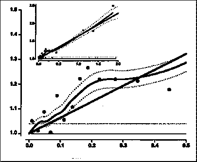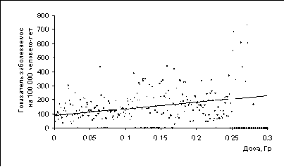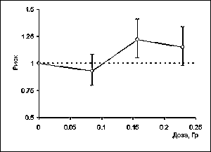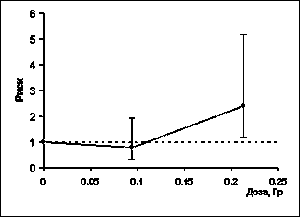 Дозовая зависимость показателя заболеваемости солидными раками среди ликвидаторов (Национальный регистр, 2001) |