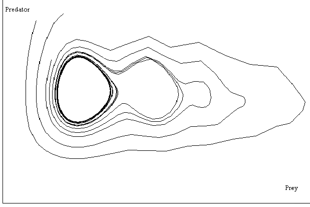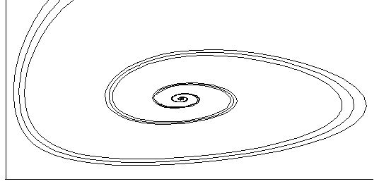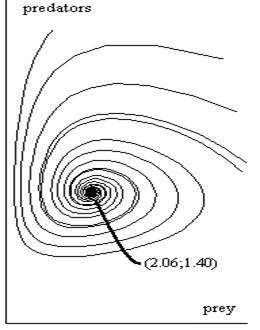 Рис.1а: То же, что на рис.1, но при других начальных условиях. Мы видим, что фокус является единственным положением равновесия в данной системе, что нежелательно с точки зрения применения рассмотрения к реальным экосистемам.