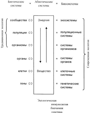 Содержание современной экологии определяется из концепции уровней организации жизни, которые составляют своеобразный биологический спектр (рис. 1). В результате взаимодействия с окружающей средой на каждом уровне (сообщество, популяция, организм, орган, клетка, ген) возникают соответствующие функциональные системы (генетические, клеточные, органные, системы организмов, популяционные и экосистемы). Верхняя часть этого спектра является предметом изучения классической экологии. В настоящее время развитие экологии по пути углубленного исследования воздействия факторов окружающей среды на различные функциональные процессы организма привело к выделению таких новых отраслей, как экобиохимия, экогенетика, экоиммунология.