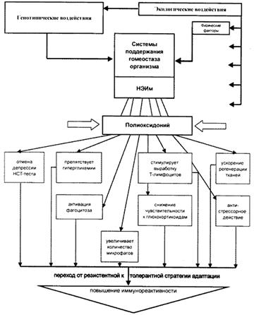 Полученные результаты позволяют отнести полиоксидоний к стресс-ограничивающим факторам, т.е. факторам, препятствующим реализации эффектов глюкокортикоидов на ткани-мишени. Это определяет переход организма к толерантной стратегии адаптации (в отличие от обычной стрессорной, резистентной, калоригенной, неэкономной) в процессе неспецифического усиления иммунореактивности. Данные об уменьшении тяжести стрессорной патологии на фоне иммуностимуляции открывают важную перспективу в профилактике и лечении неинфекционных болезней человека. Иными словами, можно поставить вопрос о неспецифической иммунопрофилактике стрессорной патологии. Механизм формирования толерантной стратегии адаптации при неспецифической иммуномодуляции представлен на рис. 4.