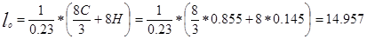 Определение теоретически необходимого количества воздуха при полном сгорании жидкого топлива. Наименьшее количество кислорода Оо, которое необходимо подвести извне к топливу для полного его окисления, называется теоретически необходимым количеством кислорода. В двигателях внутреннего сгорания необходимый для сгорания кислород содержится в воздухе, который вводят в цилиндр во время впуска. Зная, что кислорода в воздухе по массе 0,23%, а по объему 0,208%, получим теоретически необходимое количество воздуха для сгорания 1кг топлива :