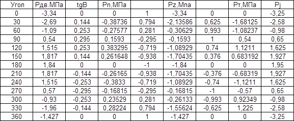 Определение движущей силы, где Р0 = 0,1 МПа, Рдв = Рr +Pj — P0, где Рr — сила давления газов на поршень, определяется по индикаторной диаграмме теплового расчета. Все значения движущей силы в зависимости от угла поворота приведены в таблице 8. Зная движущую силу определим радиальную, нормальную и тангенциальную силы :