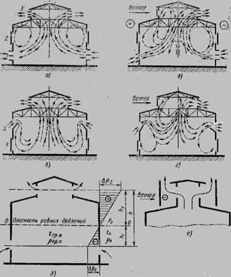 а, б — открытие створок проемов при безветрии в теплое и холодное время года; в, г— то же. при боковом ветре; д —распределение давления воздуха в здании цеха; е — незадуваемый фонарь