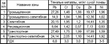 Как видно из таблицы 1, в верхнем 10 см слое почв содержание изученных подвижных форм ТМ (Сг, Сu, Zn, Ni) не превышает ПДК. Однако, во всех случаях содержание подвижных форм свинца в 1,4-4,6 раза больше. Особенно высокие превышения по Рb наблюдаются в транспортной, транспортно-селитебной и промышленной зонах, а наименьшие – в рекреационной зоне. Вызывает некоторое недоумение высокое содержание Рb в селитебной зоне по сравнению с промышленной, однако это легко объясняется насыщенностью этой территории легковыми автомобилями, которые в настоящее время составляют 85% от всего автотранспорта.