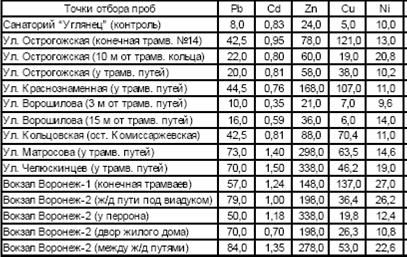 В 2001 г. в г. Воронеже зарегистрировано 14497 действующих источников загрязняющих веществ (в том числе организованных – 12475), тогда как в 1997 г. их было лишь 11699 (в том числе организованных – 11106) [4, 5]. Среди выбросов основными загрязняющими веществами считаются диоксид азота, диоксид углерода, сернистый ангидрид, пыль, а среди приоритетных – формальдегид, фенол, толуол, ксилол, бенз(а)пирен, марганец и его соединения, стирол, бутадиен, оксиды хрома, оксид меди. Из всей суммы выбросов более 80% падает на автотранспорт, который по диоксидам азота дает 80%, а по углеводородам – 96% от всех загрязнений. Таким образом, из тяжелых металлов в вышеуказанный перечень вошли только соединения марганца, меди, хрома. Однако, все предприятия топливного комплекса (ТЭЦ-1, ТЭЦ-2, котельные “Воронежтеплосеть”) и множество других выбрасывают в окружающую среду большое количество тяжелых металлов, которые могут находиться в атмосфере в виде окислов, отдельных мелких частиц в составе пыли, органо-минеральных соединений.