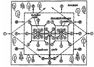 Рис. 1. Негативные факторы воздействия в системе “человек — среда обитания”: 1-естественных стихийных явлений; 2 — производственной среды на работающего; 3 — производственной среды на городскую среду (среду промышленной зоны); 4 — человека (ошибочные действия) на производственную среду; 5 — городской среды на человека, производственную и бытовую среду; 6 — бытовой среды на городскую; 7— бытовой среды на человека; 8 — человека на бытовую среду; 9 — городской среды или промышленной зоны на биосферу; 10 — биосферы на городскую, бытовую и производственную среду; 11 — человека на городскую среду; 12-человека на биосферу; 13 — биосферы на человека.