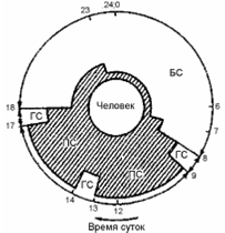Рис. 2. Суточная миграция городского жителя в системе «человек-техносфера»: БС-бытовая среда;