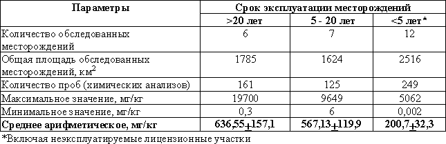 Для расчета средних концентраций углеводородов в почвах использовались результаты анализов проб, отобранных вне нефтяных разливов, т.е. за пределами визуально наблюдаемого нефтяного загрязнения. Рассчитанная на основании этих материалов средняя концентрация углеводородов в почвах месторождений, эксплуатирующихся более 20 лет и месторождений со сроком эксплуатации от 5 до 20 лет, в 3,2 и в 2,8 раза больше, чем на неразрабатываемых лицензионных участках и месторождениях, находящихся на начальных стадиях освоения (отличия достоверны при Р<0,01). При этом среднее содержание нефтепродуктов в почве месторождений со сроком эксплуатации более 20 лет статистически не отличалось от аналогичного значения для месторождений разрабатываемых в течение 5 – 20 лет (табл. 1).