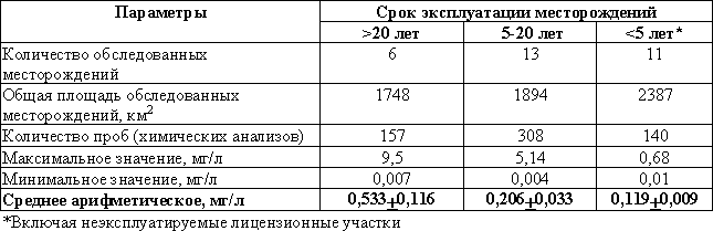 В расчетах средних концентраций нефтепродуктов в поверхностных водах объединены результаты анализов из рек (кроме р. Обь), ручьев, озер, а также болотные воды и вода из временных водоемов. Для них прослеживается более четкая связь концентрации нефтепродуктов со сроком эксплуатации месторождений (табл. 2). Количество углеводородов в воде на неразрабатываемых участках и месторождениях, находящихся на начальной стадии освоения, в 1,7 раза меньше, чем на месторождениях, осваиваемых в течение 5 – 20 лет, и в 4,5 раза меньше, чем на месторождениях со сроком эксплуатации более 20 лет (все отличия достоверны при Р<0,01). Как и для почв, величина относительной ошибки средней концентрации нефтепродуктов в воде, растет по мере увеличения срока эксплуатации месторождения.