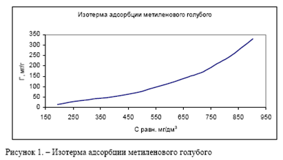 Адсорбция метиленового голубого. Адсорбция метиленового голубого дает представление о поверхности сорбента, образованной порами с диаметрами больше 1,5 нм. Молекула метиленового голубого имеет относительно большие линейные размеры, тем не менее с помощью адсорбционных опытов было установлено, что эта молекула адсорбируется как плоская пластина [4]. Сорбцию метиленового голубого проводили по ГОСТ 4453 – 74 в диапазоне исходных концентраций от 100 мг/дм3 до 1000 мг/дм3, температура – 25ºС. Навеска сорбента была постоянной и составляла 0.40 г, объем раствора – 200 см3. Остаточную концентрацию красителя находили по калибровочной кривой. В исследуемом диапазоне концентраций максимальная величина сорбционной емкости твердого остатка пиролиза автомобильных шин составила 320 мг/г, что не ниже аналогичной величины для известных марок активных углей [5]. Вид адсорбционной кривой представлен на рисунке 1.