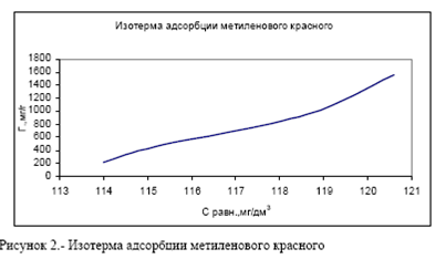 Аналогичный опыт проведен для метиленового красного (остаточную концентрацию красителя определяли фотометрическим методом), в результате была найдена сорбционная емкость, равная 450 мг/г. Вид изотермы представлен на рисунке 2