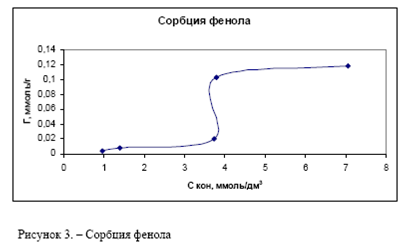 Адсорбция фенола. Согласно этому способу сорбцию фенола проводили из растворов в диапазоне исходных концентраций 1.0 – 10.0 ммоль/ дм3, навеска сорбента – 1.0 г, объем раствора -200 см3. Остаточную концентрацию фенола находили бромид-броматным методом. Найденная величина сорбционной емкости составила 244 мг/г, что согласуется с литературными данными, приведенными для адсорбции фенола из водных растворов на угле КАД. В этом случае была получена изотерма приведенная на рисунке 3.