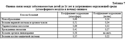 Для оценки значимости влияния загрязнения окружающей среды свинцом на отдельные классы болезней детского населения нами были рассчитаны коэффициенты корреляции между загрязнением и заболеваемостью (табл. 7) [5].