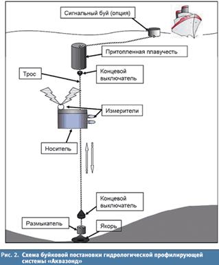 Основа подводной части подсистемы гидрометеорологического мониторинга — заякоренный автоматический профилирующий комплекс «Аквазонд» (см. рис. 2) — своего рода морской грузовой лифт. Этот прибор перемещает полезный груз — измерительную аппаратуру, передвигаясь по тросу, натянутому вертикально между подповерхностной плавучестью и донным якорем. В отличие от традиционных буйковых постановок с размещением приборов на фиксированных горизонтах, в данном случае измеряются непрерывные вертикальные распределения (профили) параметров среды и биоты, что позволяет точно оценивать как дифференциальные, так и интегральные характеристики этих распределений. Наряду с этим носитель может останавливаться — «зависать» на нужное время, чтобы произвести измерения на заданных горизонтах. Передача данных с «Аквазонда» осуществляется по ходовому тросу с помощью магнитных модемов и далее по кабелю или по подводному гидроакустическому каналу в подсистему информационного обеспечения на нефтедобывающей платформе.