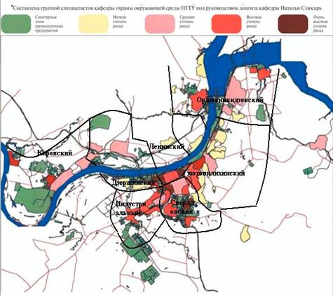 Группой специалистов кафедры охраны окружающей среды ПГТУ под руководством доцента кафедры Н. Слюсарь была выполнена работа по зонированию территории города Перми по степени экологической опасности. С помощью экспертного метода АВС, территория города была поделена на зоны с низкой, средней, высокой и очень высокой степенью экологического риска. Была составлена карта зонирования территории г. Перми. По данным этой работы, можно сделать вывод, что к территориям с высокой антропогенной нагрузкой и неблагоприятной экологической ситуацией относятся Индустриальный, Свердловский, часть Орджоникидзевского и Ленинского районов. К территориям с низким экологическим риском относятся часть Дзержинского и часть Орджоникидзевского районов.