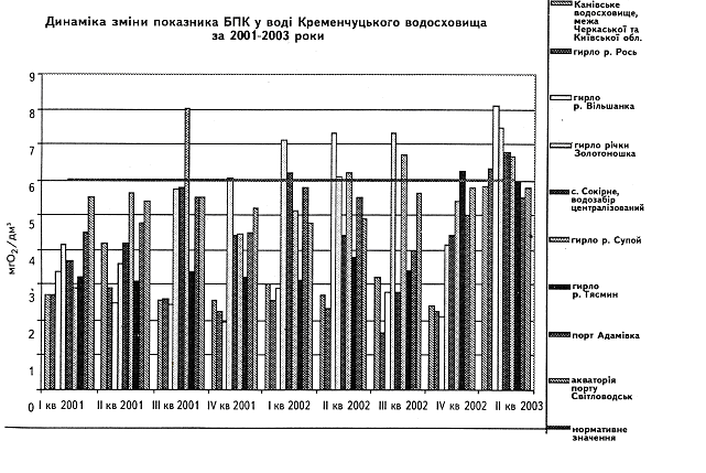 Рисунок 2.1 – Динаміка зміни показника БКП у воді кременчуцького водосховища за 2001-2003 роки.