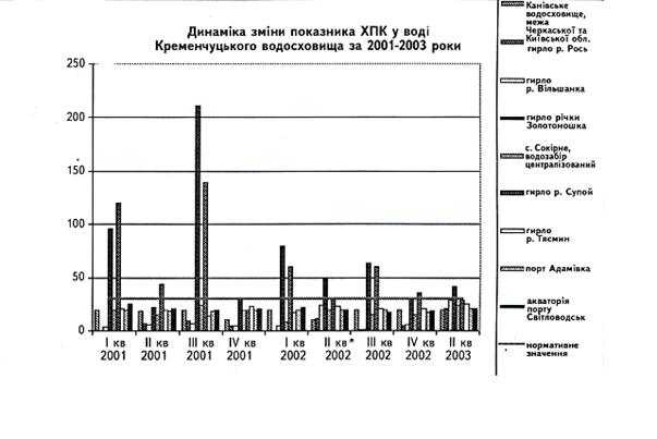 Рисунок 2.2 — Динаміка зміни показника ХПК у воді Кременчуцького водосховища за 2001-2003 роки.