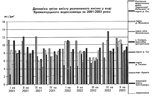 Рисунок 2.3 – Динаміка зміни вмісту розчиненого кисню у воді Кременчуцького водосховища за 2001-2003 роки.