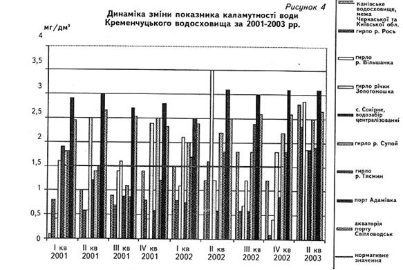Рисунок 2.4 – Динаміка показника каламутності води Кременчуцького водосховища за 2001-2003 роки.