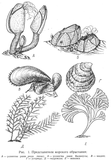 Обрастание – это сообщество животных и растений, обитающих на твердом субстрате. Обычно в нем преобладают прикрепленные организмы, а подвижные обитают среди них, используя их в качестве пищи и убежища. Обрастание антропогенных субстратов практически не отличается от обрастания природных. Правда, на днищах судов было найдено несколько новых видов усоногих раков. Но это связано с плохой изученностью этой группы в тропических районах. Скорее всего, эти виды, как и все другие, имеют корни среди обрастателей природных субстратов. Человек сравнительно недавно стал завоевывать водную стихию, и новые виды на антропогенных субстратах за 1 – 2 века просто не могли образоваться.