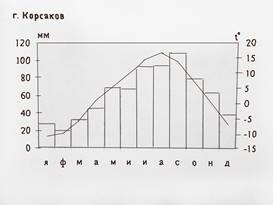 Изучив биологию этого растения можно сказать, что оно является стенобионтом по некоторым факторам среды. Во-первых, для размножения этого растения необходимо много воды. Так, как плодоносит и цветет тиллея в июле – августе, то наиболее благоприятный для этого водный режим присутствует именно на юге Сахалина. Условия, присущие ареалу тиллеи – Корсаковскому району, являются самыми оптимальными. В климатограмме г. Корсакова (рис. 5) показано, что наибольшее количество осадков приходится именно на месяцы июль-сентябрь.