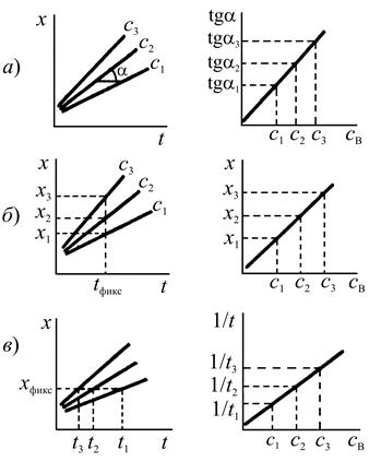 Способ фиксированной концентрации. В отдельных пробах с известными концентрациями определяемого вещества проводят индикаторную реакцию до строго определенной (фиксированной) концентрации индикаторного вещества хфикс. и измеряют время достижения этой концентрации. Градуировочный график строят в координатах: концентрация определяемого компонента — величина, обратная времени достижения хфикс. (рис.1, в).