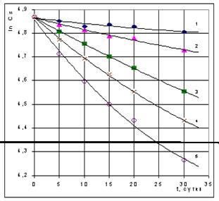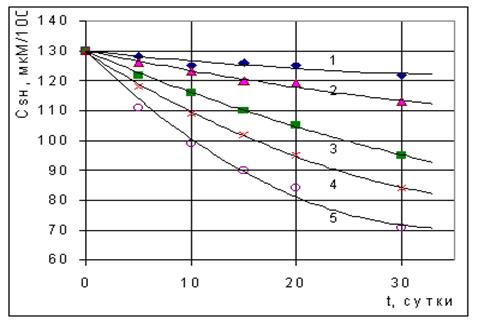 Рис. 1. Изменение концентрации сульфгидрильных групп в теле личинок русского осетра при их экспозиции в воде, содержащей O.05 (1), 0.25 (2), 0.50 (3), 0.75 (4) и 1.00 (5) мг/л нефти. Точки — экспериментальные данные, сплошные линии — расчет по уравнению (14).