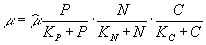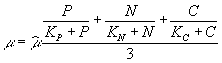 Формула (3.3) упрощается в связи с предположением, подтвержденным экспериментально, что константа полунасыщения и минимальное клеточное содержание соответствующего биогена равны, и принимает вид