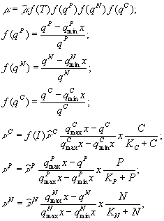 Как уже было сказано, скорость роста зависит от концентрации биогенных веществ. Для фитопланктона элементами, способными лимитировать рост, могут являться, например, азот, фосфор и углерод. Возможные способы отражения этого факта в работе С.Йоргенсена описаны следующим образом