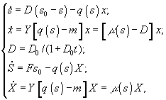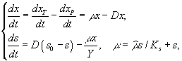 . В этом случае динамика лимитирующего субстрата s и микробной биомассы x описывается системой