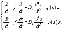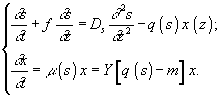 f – скорость перемещения малого элемента культуральной жидкости по пространственной координате z; Ds и Dx – коэффициенты диффузии для субстрата и клеток;