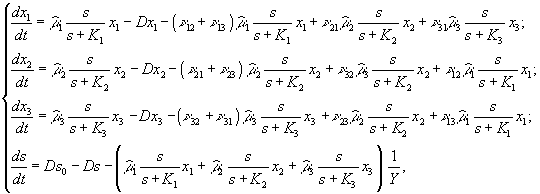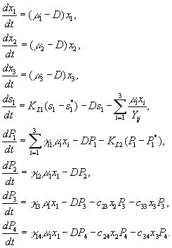 В вышеприведенных уравнениях использованы обозначения: xi (i = 1,2,3) – бактериальная биомасса метилотрофа и двух видов гетеротрофов;