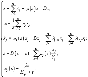 – концентрация j -го субстрата в поступающей в реактор питательной среде, и задается системой уравнений