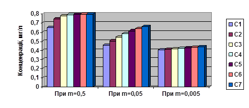 =0,4 мг/л, m=0,5; 0,05; 0,005, t=330 діб. Необхідно розрахувати концентрацію ЗР у ҐВ протягом семи років після випадення забруднених атмосферних опадів.