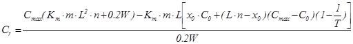 Розрахувати Сr та G токсичної речовини (Pb) у промислових рідких відходах у накопичувачі при наступних вихідних даних: ГДК (Pb) = 0,03 мг/дм3 (ГОСТ 2874-82); Сmax =10·ГДК=0,3 мг/дм3; L=550 м; W=5*105 м3; te =15 років; m=20 м; Кm =1; n=0,1; КФ =10 м/добу; і=0,001; С0=0,001 мг/дм3 (мг/л).
