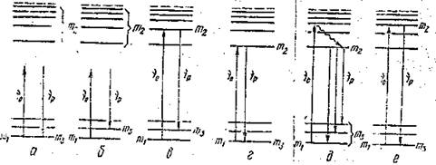 Ряс. 1. Диаграмма энергетических уровней атома или молекулы и процессов взаимодействия, связанных с рассеянием и флуоресценцией: а — рэлеевское рассеяние; б — стоксово комбинационное рассеяние; в — резонансное комбинационное рассеяние; г — резонансная флуоресценция; д — широкополосная нерезонансная флуоресценция; е — резонансное рассеяние; m1, т2 и m3 — начальный, промежуточный и конечный уровни.