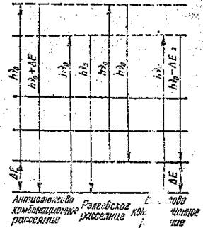 В процессе рассеяния кванта света с энергией hv0на молекуле, находящейся в переходном состоянии с энергией Е, молекула претерпевает двойной переход, поглощая и испуская фотон. При поглощении фотона энергия молекулы возрастает до уровня Е + hv0и, если этот уровень энергии не окажется стационарным, молекула возвращается на какой-то другой уровень ЕI с испусканием кванта света. Если ЕI > E, то энергия фотона уменьшается до hv0-(EI — Е), тогда как внутренняя энергия молекулы увеличивается на(EI — Е). Последний процесс возможен только в случае, когдапереходный энергетический уровень Е не соответствует основному энергетическому состоянию. Рассеянное излучение, возникающее при этом, отличается по частоте от возбуждающего, излучения. При ЕI > Е излучается стоксова, а при ЕI < Е — антистоксова компонента КР. На рис. 3 показана диаграмма энергетических уровней и переходов в молекуле при КР.