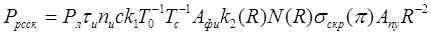 где Рл — мощность возбуждающего излучения лазера; tи — длительность импульса; пк — число рабочих импульсов; k1 — общий коэффициент пропускания оптики; Т0и Тс коэффициенты потерь излучения при его однократном прохождении через атмосферу в области возбуждающей и смещенной линии соответственно; Апу — коэффициент, суммарно учитывающий параметры приемно-усилительной системы; Афп — эффективная площадь приемника; k2 —коэффициент, учитывающий перекрывание возбуждающего и возвращенного пучков; N (R) — плотность атмосферы; sс — сечение рассеяния в обратном направлении; R— расстояние (высота).