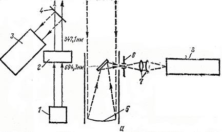 Рис. 5. Схема (а) и внешний вид (б) типичного лидара: 1 – импульсный рубиновый лазер; 2 – кристалл — удвоитель частоты; 3 – фотодиод для измерения импульса; 4 – полупрозрачное зеркало; 5 – зеркало приемного телескопа; 6 – диафрагма; 7 – осветительная оптика; 8 – двойной монохроматор с ФЭУ, усилительной и регистрирующей системами.