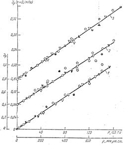 Рис. 6. Интенсивность стоксовой компоненты КР О2 (1), N2 (2) и СО2 (3), измеренная в воздухе, при комнатной температуре с помощью спектрографа, фильтрами, Р = 0,21; 28 кПа, Р = 13,3 – 106, 4 кПа;