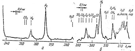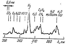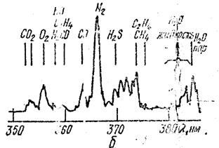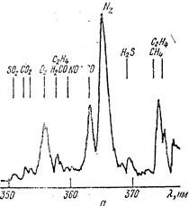 В дальнейшем источниками возбуждения служили излучение с азотного лазера и второй гармоники лазера на кристалле Nd3+ YAG(l = 532,0 нм). Последняя система положена в основу промышленного образца прибора. Разработанные лидары были использованы для проведения физических исследований атмосферы и, в частности, для измерения концентрации посторонних веществ. Удалось отождествить в дыму и выхлопных газах автомобиля повышенное содержание СО2, и СО (0,11 и 0,43 %), а также SО2, С2 Н4, Н2 СО, NО, Н2, С3 Н4, СН4, паров воды (рис. 9).
