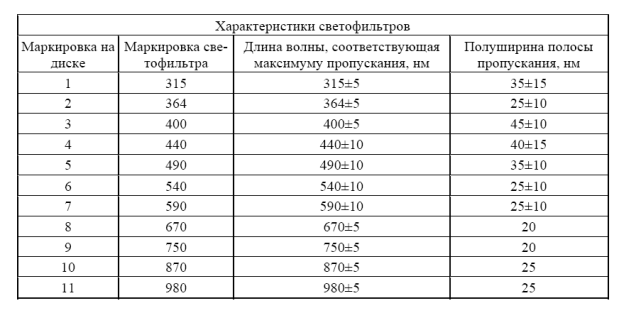 Светофильтры. Для того чтобы из всей видимой области спектра выделить лучи определенных длин волн в фотоколориметрах на пути световых потоков перед поглощающими растворами устанавливают избирательные поглотители света – светофильтры. Светофильтры пропускают лучи лишь в определенном интервале длин волн с полушириной пропускания λ1/2макс–λ’1/2макс и практически полностью поглощают лучи других длин волн (см. таблицу). Чем уже область максимального пропускания лучей (размытость максимума пропускания) светофильтра, тем выше его избирательность к лучам этого интервала длин волн.