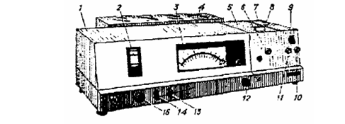 1 — монохроматор; 2 — шкала длин волн; 3 — измерительный прибор; 4 — осветитель с источником излучения и стабилизатором; 5 — кюветное отделение; 6 — рукоятка перемещения каретки с кюветами; 7 — камера с фотоприемниками и усилителем; 8 -рукоятка переключения фотоэлементов; 9 — рукоятка установки чувствительности; 10 — рукоятка установки на «0»; 11 — рукоятка шторки; 12 — рукоятка регулировки ширины щели; 13 — рукоятка «Отсчет»; 14 — рукоятка компенсации; 15 – рукоятка шкалы длин волн.