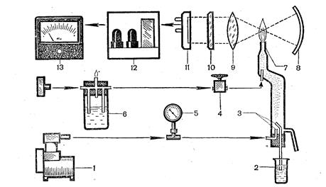 Пламенный фотометр используется для определения интенсивности излучения элементов, которые могут возбуждаться пламенем горелки (рис. 4). Исследуемый раствор при помощи сжатого воздуха подают в распылитель, откуда он в виде аэрозоля попадает в пламя горелки. Излучение пламени собирается вогнутым зеркалом и направляется линзой на светофильтр, а далее к фотоэлементу. Возникающий здесь фототок усиливается усилителем и измеряется чувствительным гальванометром.