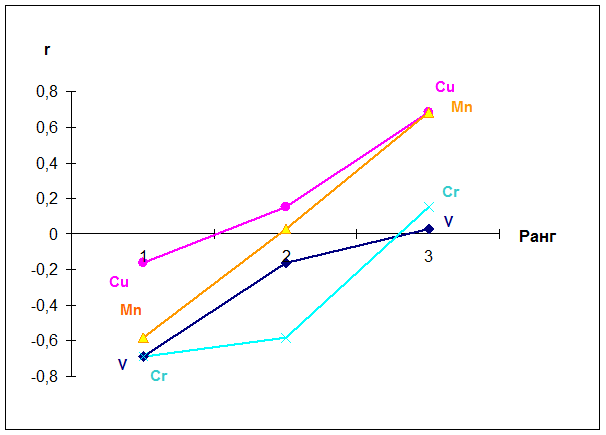 4. Розрахувати коефіцієнт кореляції по 4 хімічним елементам (V, Cu, Mn, Cr);