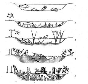 Рис. 1. Сукцесія, яка відбувається від озера через луку до лісу.