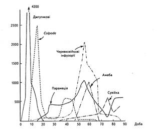 Рис. 2. Сукцесії простіших в настої сіна. Зміна кількості особин залежно від віку культури, в днях: По осі ординат — кількість індивідів різних видів в см3 .
