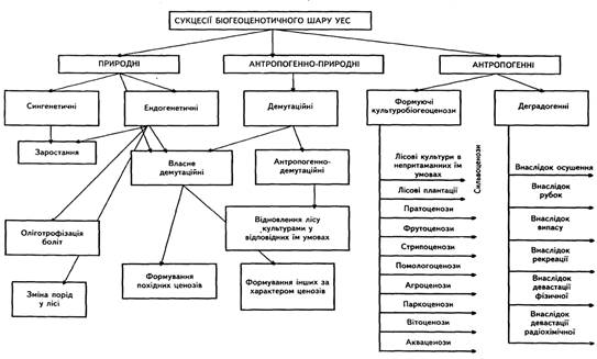 Сьогодні, коли ми маємо справу з численними антропогенними сукцесіями, їх поділяють на культурні (створення культурфітоценозів) і акультурні, або деградаційні (рис.2).