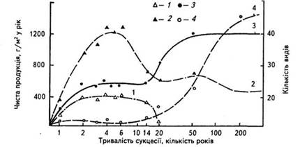 Рис. 4. Зміна видового різноманіття і чистої первинної продукції в ході сукцесії, що веде до встановлення клімаксового мішаного лісу із сосни та дуба: 1 — трав'яні рослини, 2 — чагарники, 3 — сосна, 4 — дуб.